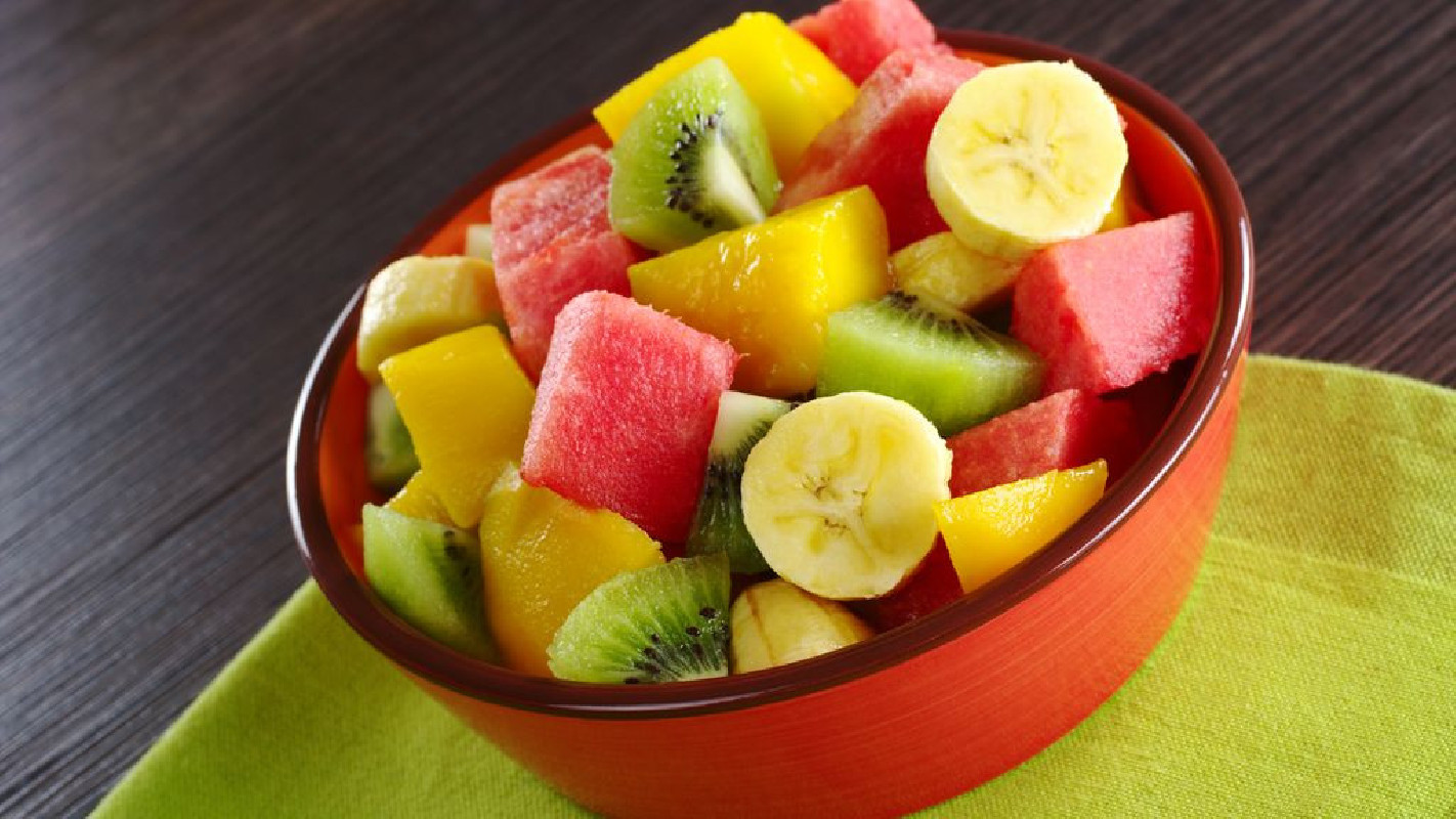 Salade de fruits frais exotiques (banane, pastèque, mangue et kiwi)