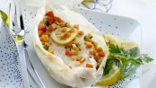Cabillaud cuit en papillote accompagné de ses petits légumes (carottes, poireaux, tomates)